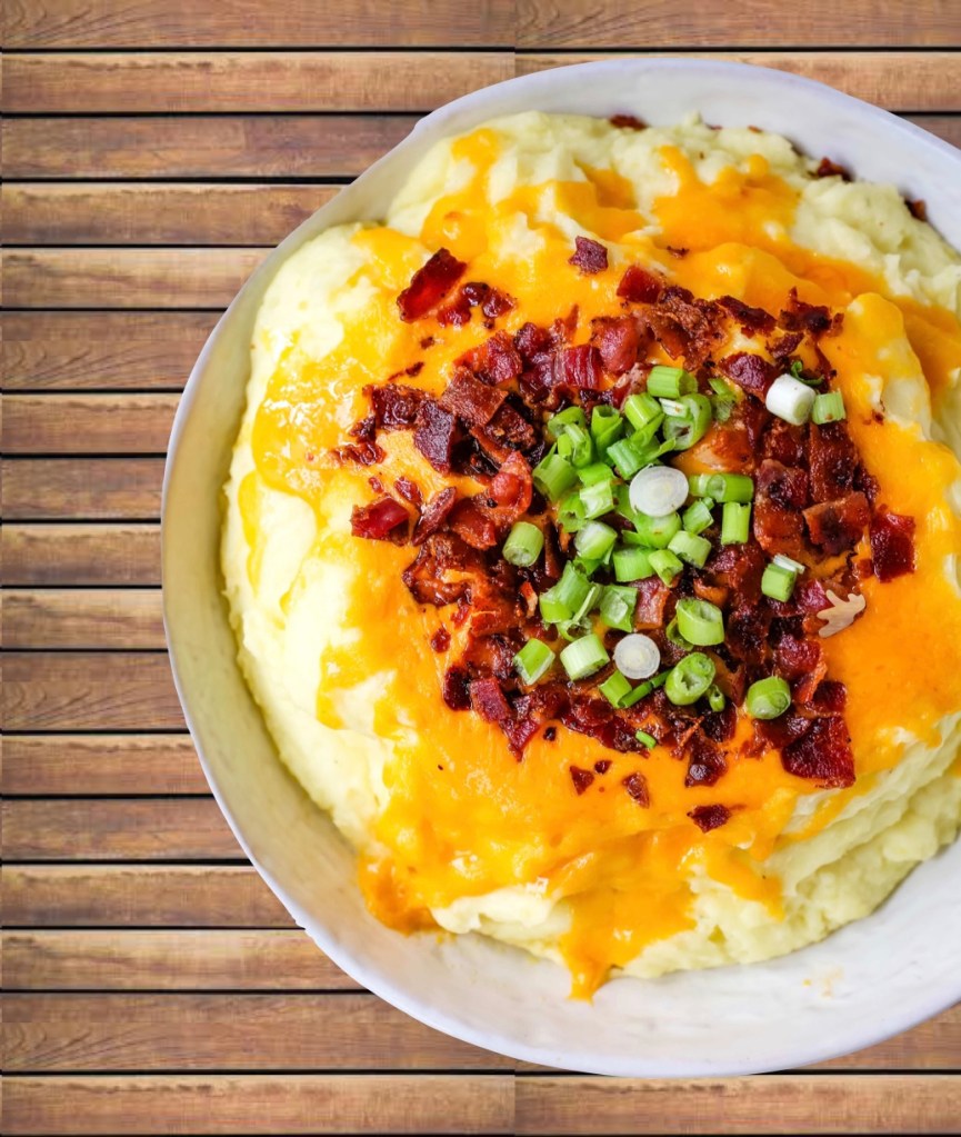 - Transfer the fully loaded mashed potatoes to a serving dish and sprinkle some additional shredded cheese, bacon, and green onions on top as garnish.